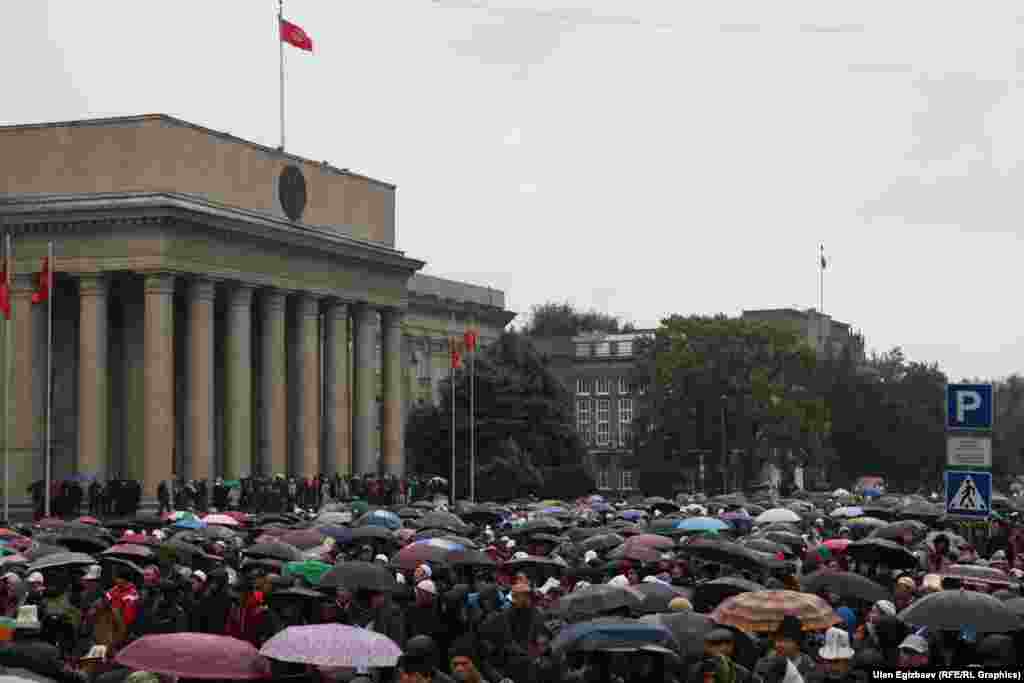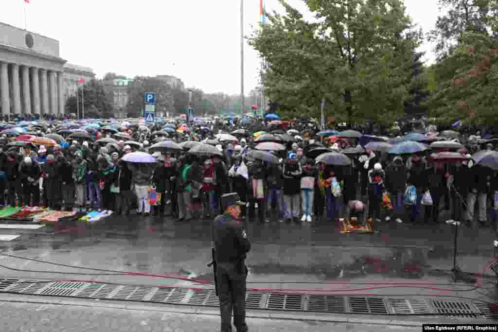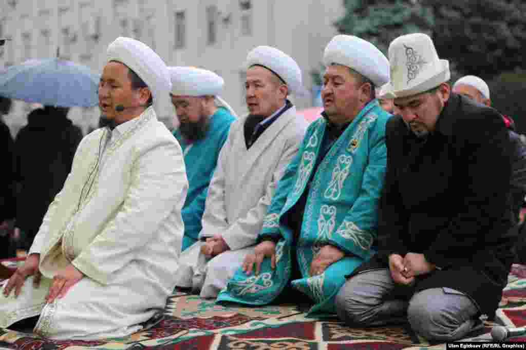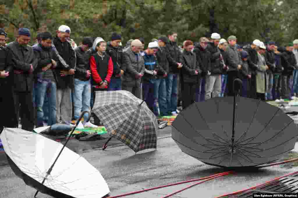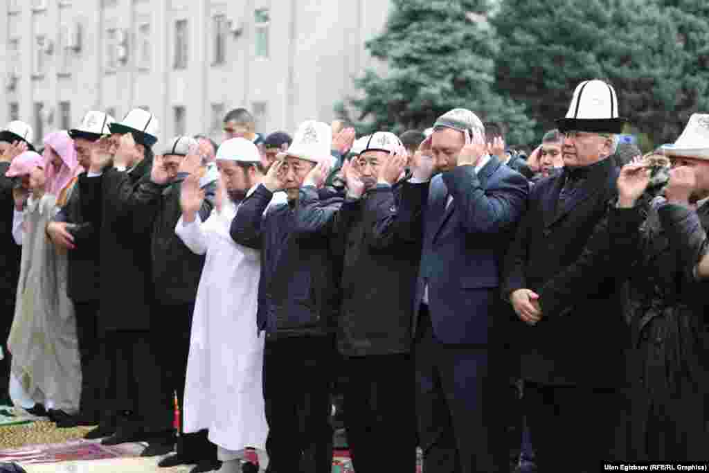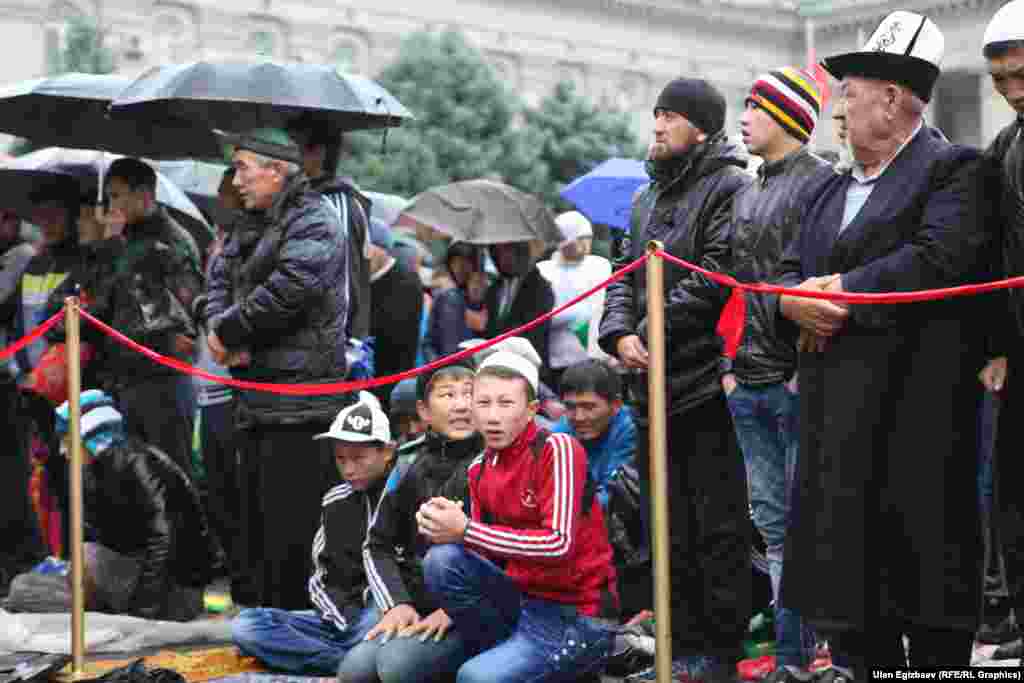 В Бишкеке с утра прошел праздничный айт-намаз. Несмотря на дождь на старую площадь пришло много людей. С поздравительной речью выступили заместитель муфтия Равшан ажы Эратов и спикер Жогорку Кенеша Асылбек Джээнбеков.