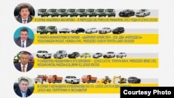Кроме того, у следующих депутатов и их семей есть Lexus 470 (точная марка не указана) – Айбека Алтынбекова, Кенжебека Бокоева, Зиядина Жамалдинова, Жыргалбека Калмаматова, Талайбека Масабирова. У Жунуса Адыл уулу, Мурадыла Мадеминова, Кубанычбека Нурматова, Максата Сабирова и Бакыт Есентаевой - Lexus GX470.