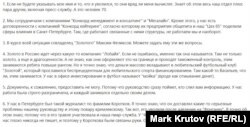 Радио Свобода вступило в переписку с "Максимом", задав ему несколько уточняющих вопросов и попросив предоставить какую-либо информацию в подтверждение своих заявлений. В ответ мы получили сообщение, в котором утверждалось: "585 Золотой" сотрудничала с компаниями Пригожина "Мегалайн" и "Конкорд менеджмент и консалтинг", а также компанией "Конкорд кейтеринг", с которой принадлежащая "Золотому" сеть пекарен "Цех 85" поделила сферы влияния в Санкт-Петербурге. Также "Максим" рассказывал, что золото поставляется из Африки через компанию Lobaye Invest, которую авторы независимых расследований связывают с Пригожиным и которая получила от правительства ЦАР концессии на разработку золотых месторождений в ЦАР. По словам нашего собеседника, он знал и о том, что журналиста Дениса Короткова уволили из издания "Фонтанка" после давления со стороны структур Пригожина. Предоставить какие-либо доказательства своей причастности к компании "585 Золотой" "Максим" отказался, сославшись на то, что это поставит его под угрозу.