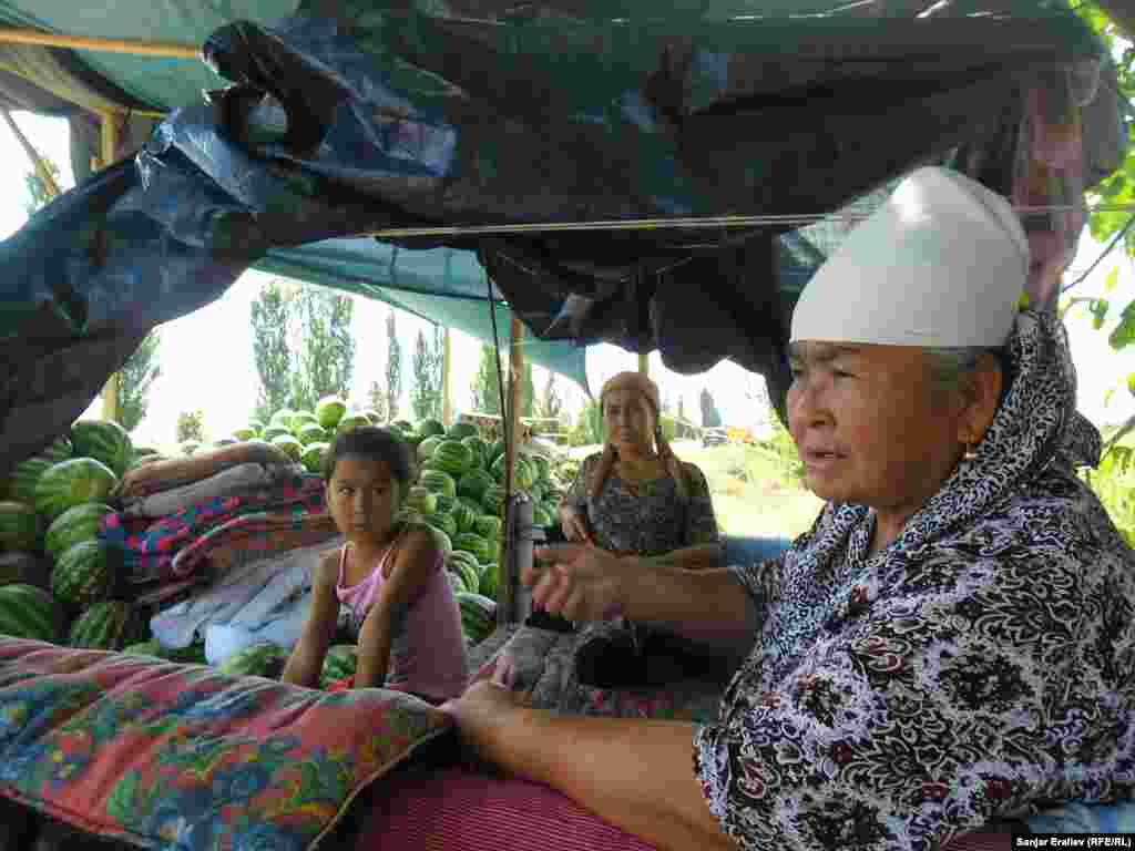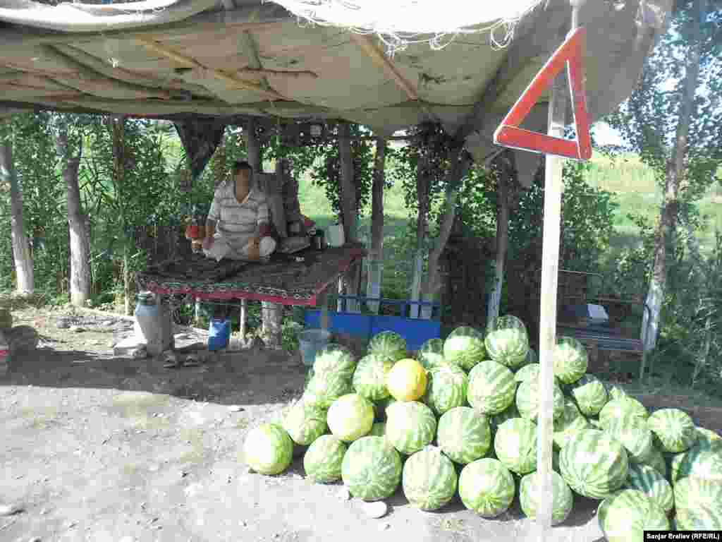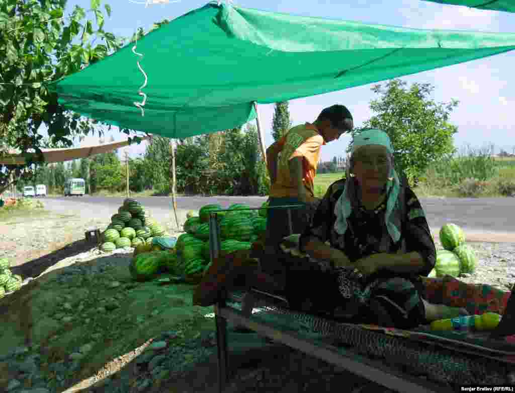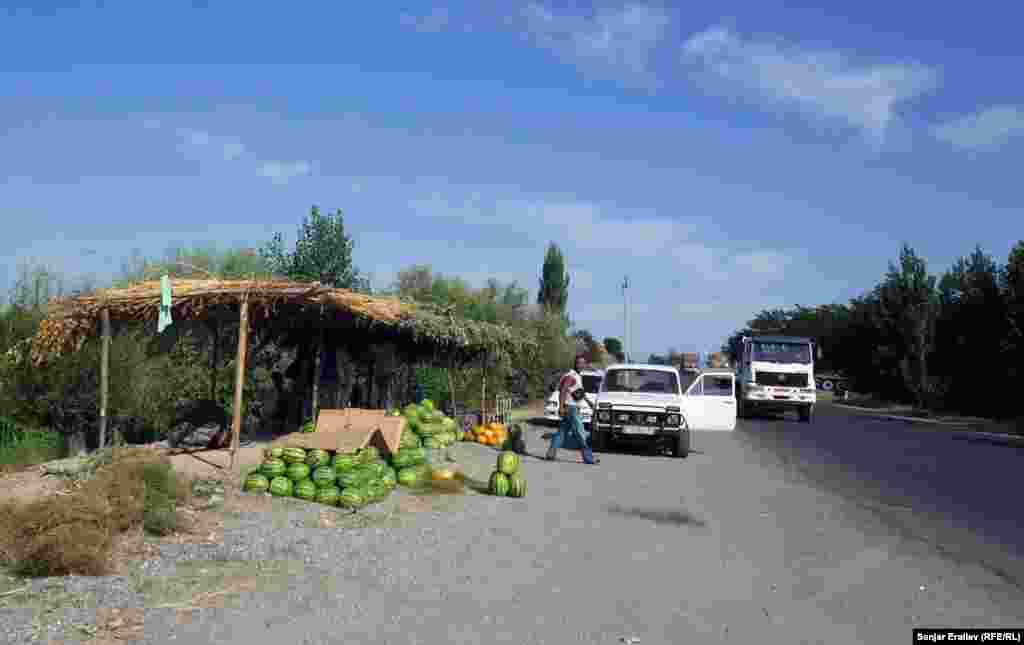 Вдоль автотрассы Бишкек-Ош у самого села Акман (Базар-Курганский район) растянулись ряды импровизированного арбузного базара. Местные крестьяне продают их от 5 до 100 сомов за одну штуку в зависимости от размера. Фоторепортаж Санжара Эралиева, корреспондента Кыргызской службы РСЕ\РС "Азаттык".