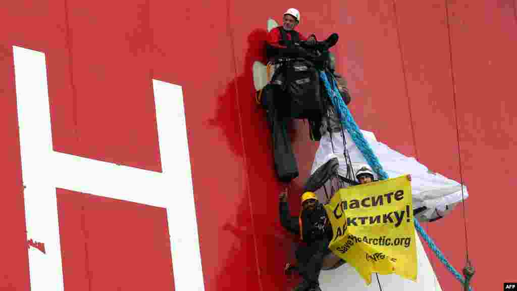 Russia -- Greenpeace activists board Gazprom’s ‘Prirazlomnaya’ Arctic oil platform somewhere off Russian north-eastern coast in the Pechora Sea, 24Aug2012