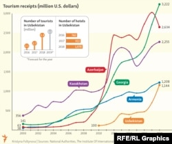 Несмотря на то, что доходы от туризма увеличились в прошлом году почти вдвое и составили около 1,2 миллиарда долларов, они всё же ниже, чем в соседнем Казахстане, а также в трех странах Южного Кавказа - Армении, Азербайджане и Грузии.